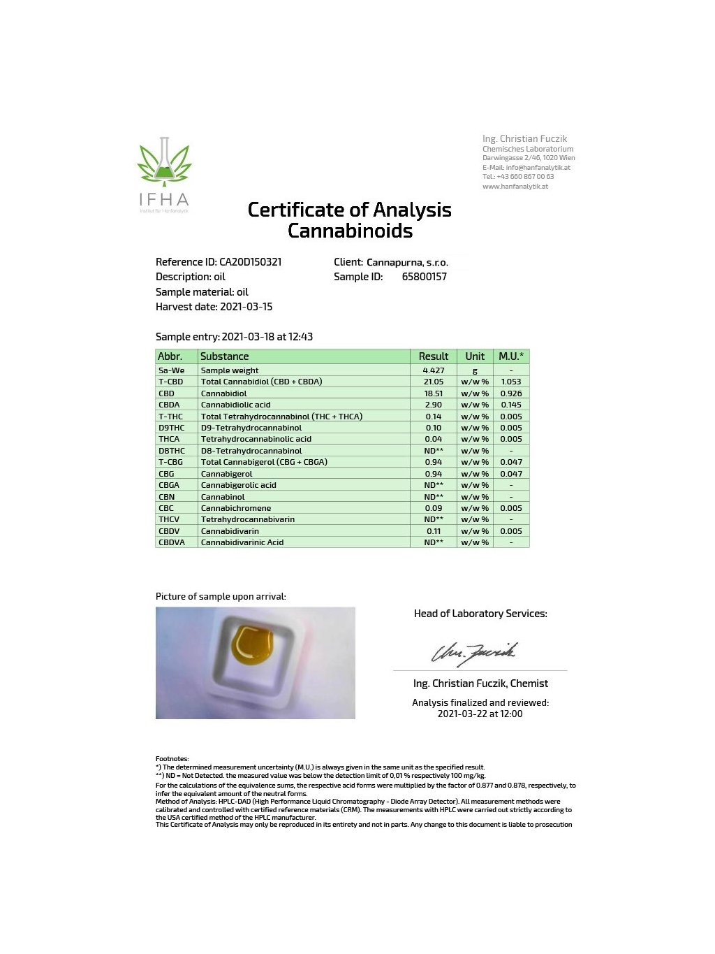 U každého produktu je přiložená laboratorní analýza. Díky certifikaci a pečlivým laboratorním testům u nás můžete zakoupit výhradně organické výrobky v podobě olejů, květů, kapslí a dalších produktů z konopí.